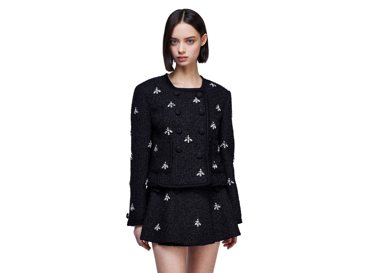 이 자켓의 가장 큰 매력은 바로 섬세한 스톤과 비즈 장식입니다. 일반적인 트위드 자켓이 원단의 짜임으로만 승부한다면, 이 제품은 움직일 때마다 조명을 받아 반짝이는 보석 디테일이 시선을 사로잡습니다.