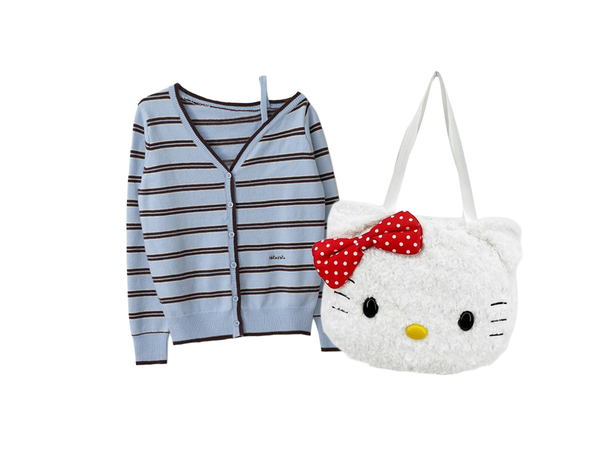 영서의 코디에 정점을 찍어준 아이템, 바로 큼지막한 헬로키티 얼굴 모양의 가방입니다. 이 제품은 단순한 가방을 넘어 하나의 ‘아트 피스’처럼 보일 정도로 디테일이 살아있는데요. 헬로키티 특유의 동그란 눈과 노란 코, 그리고 시그니처인 빨간 리본까지 고퀄리티 자수로 표현되어 있습니다.