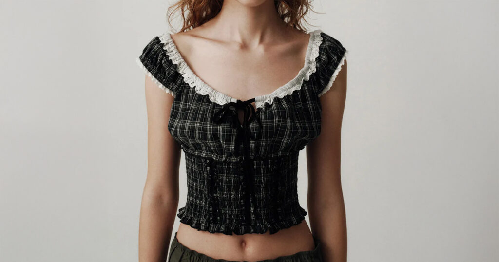 이 블라우스의 가장 큰 장점은 허리 라인을 잡아주는 스모크 밴딩입니다. 쫀쫀하게 허리를 감싸주어 상체 라인을 날씬하게 만들어주고, 크롭 기장감으로 다리가 훨씬 길어 보이는 비율을 완성해 줍니다.
