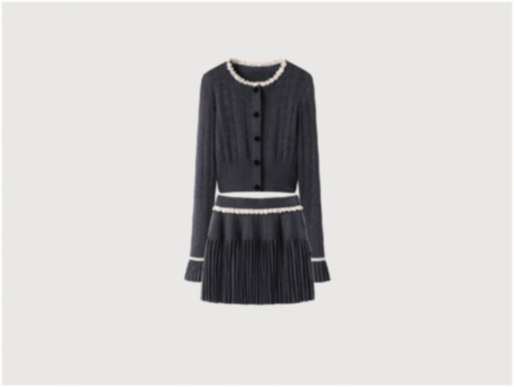 짙은 그레이톤의 니트 소재 위에 화이트 프릴 장식이 더해져 클래식한 분위기를 연출하면서도 전체 실루엣은 여성스럽고 우아한 느낌을 줘요.